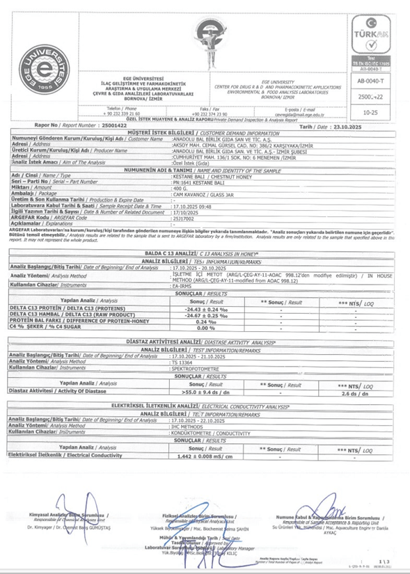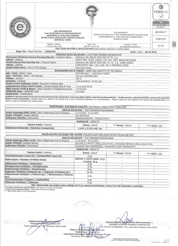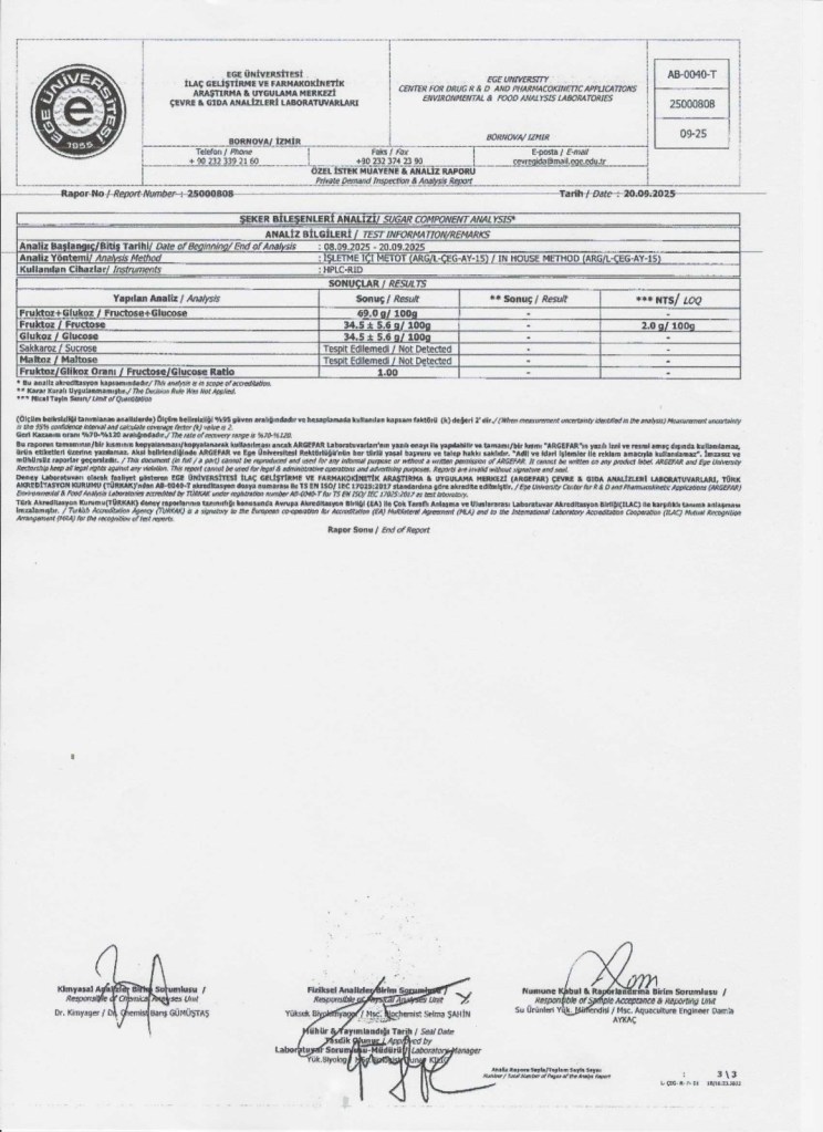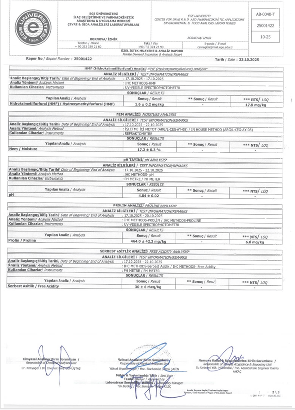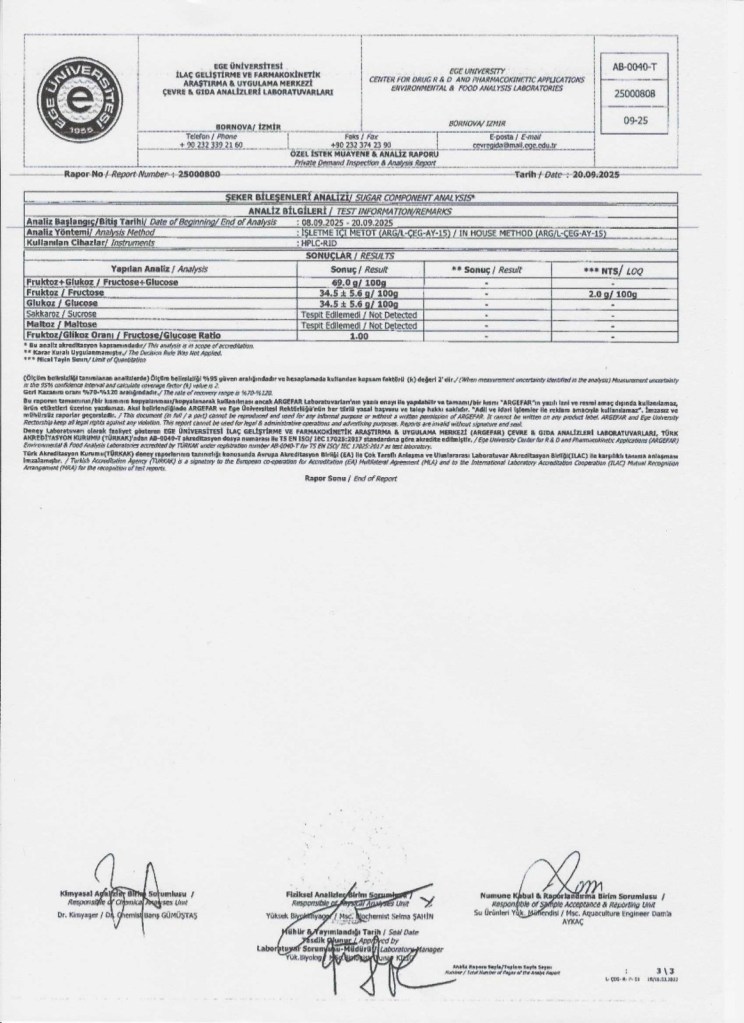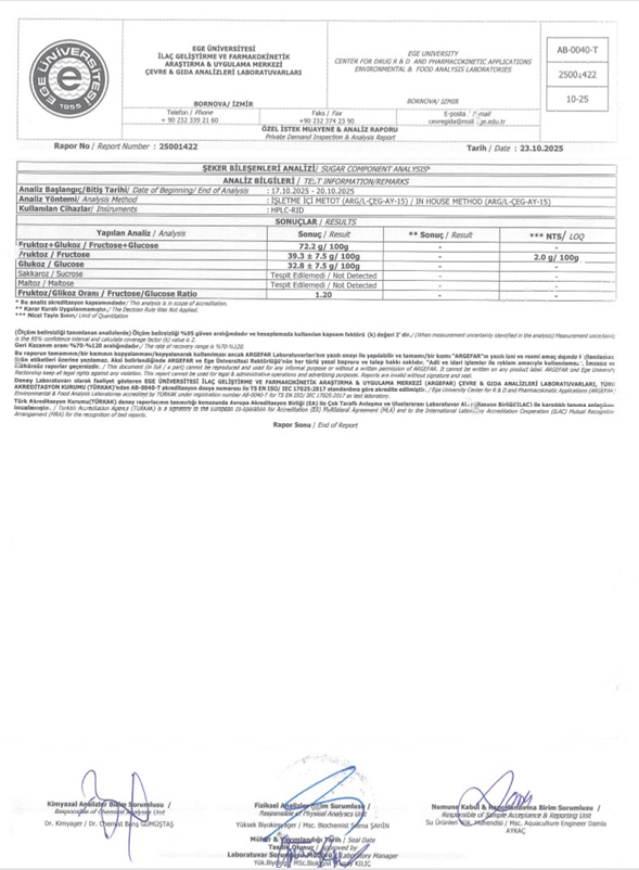 Naturege bünyesinde sunulan ballarımızın analizleri, Ege Üniversitesi ARGE FAR laboratuvarlarında yaptırılmaktadır. Fiziksel, kimyasal ve kalite parametrelerine ek olarak; özellikle monoflora ballar için büyük önem taşıyan polen analizleri de gerçekleştirilmektedir. Bu analizler sayesinde balın botanik kaynağı bilimsel olarak doğrulanmakta, ürünlerimizin saflığı ve menşei şeffaf biçimde belgelenmektedir. Kaliteyi yalnızca vaat etmiyor, bilimsel verilerle kanıtlıyoruz.